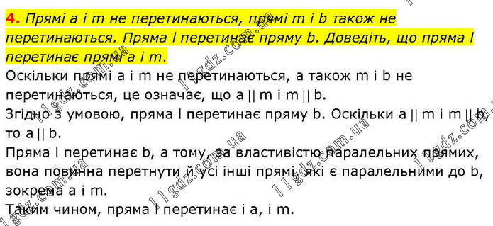 4. Прямі а і m не перетинаються, прямі m і b також не перетинаються. Пряма l перетинає пряму b. Доведіть, що пряма l перетинає прямі a i m. Оскільки прямі a і m не перетинаються, а також m і b не перетинаються, це означає, що a || m і m || b. Згідно з умовою, пряма l перетинає пряму b. Оскільки a || m і m || b, то a || b. Пряма l перетинає b, а тому, за властивістю паралельних прямих, вона повинна перетнути й усі інші прямі, які є паралельними до b, зокрема a і m. Таким чином, пряма l перетинає і a, і m.