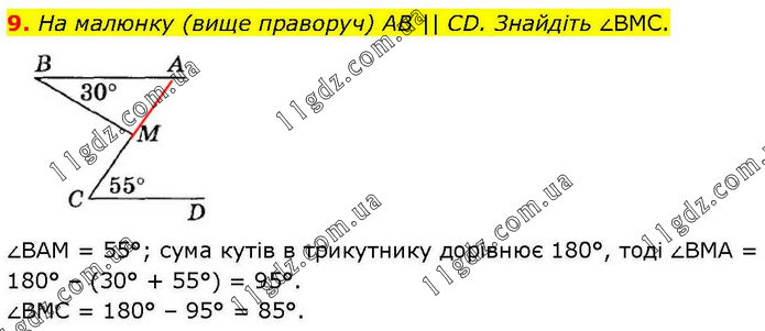 9. На малюнку (вище праворуч) AB || CD. Знайдіть ∠BMC. ∠BAM = 55°; сума кутів в трикутнику дорівнює 180°, тоді ∠BMA = 180° – (30° + 55°) = 95°. ∠BMC = 180° – 95° = 85°.