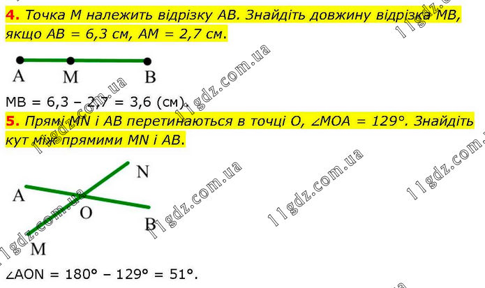 4. Точка M належить відрізку AB. Знайдіть довжину відрізка MB, якщо AB = 6,3 см, AM = 2,7 см. МВ = 6,3 – 2,7 = 3,6 (см). 5. Прямі MN і AB перетинаються в точці О, ∠MOA = 129°. Знайдіть кут між прямими MN і AB. ∠AON = 180° – 129° = 51°.