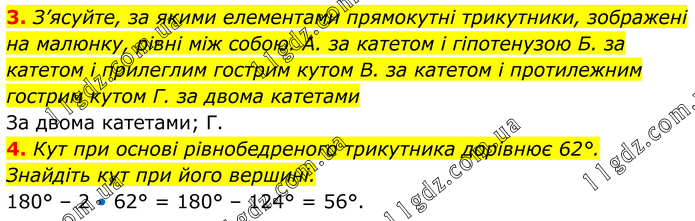 3. З’ясуйте, за якими елементами прямокутні трикутники, зображені на малюнку, рівні між собою. A. за катетом і гіпотенузою Б. за катетом і прилеглим гострим кутом B. за катетом і протилежним гострим кутом Г. за двома катетами За двома катетами; Г. 4. Кут при основі рівнобедреного трикутника дорівнює 62°. Знайдіть кут при його вершині. 180° – 2 • 62° = 180° – 124° = 56°.