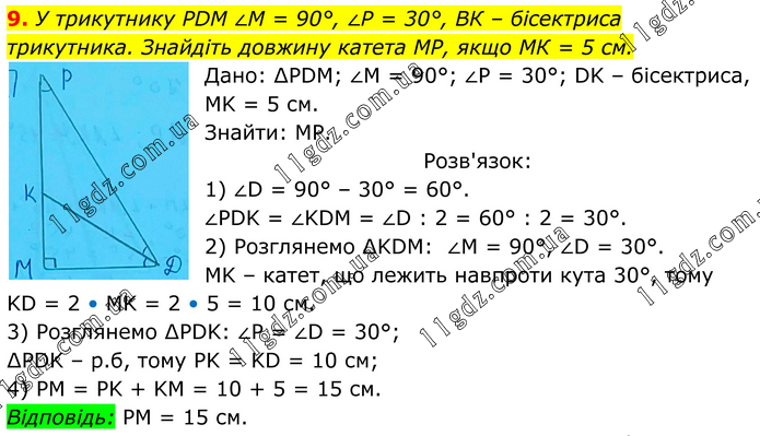 У трикутнику РDМ ∠М = 90°, ∠Р = 30°, ВК – бісектриса трикутника. Знайдіть довжину катета МР, якщо МК = 5 см. Дано: ∆PDM; ∠M = 90°; ∠P = 30°; DK – бісектриса, MK = 5 см. Знайти: МР. Розв'язок: 1) ∠D = 90° – 30° = 60°. ∠PDK = ∠KDM = ∠D : 2 = 60° : 2 = 30°. 2) Розглянемо ∆KDM: ∠M = 90°, ∠D = 30°. MK – катет, що лежить навпроти кута 30°, тому KD = 2 • MK = 2 • 5 = 10 см. 3) Розглянемо ∆PDK: ∠P = ∠D = 30°; ∆PDK – р.б, тому PK = KD = 10 см; 4) PM = PK + KM = 10 + 5 = 15 см. Відповідь: PM = 15 см.