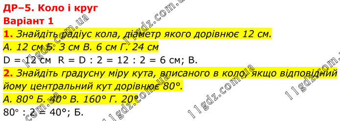 ДР–5. Коло і круг Варіант 1 1. Знайдіть радіус кола, діаметр якого дорівнює 12 см. А. 12 см Б. З см В. 6 см Г. 24 см D = 12 см R = D : 2 = 12 : 2 = 6 см; В. 2. Знайдіть градусну міру кута, вписаного в коло, якщо відповідний йому центральний кут дорівнює 80°. А. 80° Б. 40° В. 160° Г. 20° 80° : 2 = 40°; Б.
