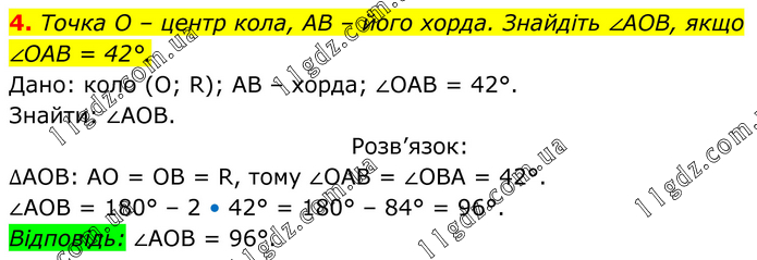 Точка О – центр кола, АВ – його хорда. Знайдіть ∠АОВ, якщо ∠ОАВ = 42°. Дано: коло (O; R); AB – хорда; ∠ОАВ = 42°. Знайти: ∠АОВ. Розв’язок: ∆АОВ: АО = ОВ = R, тому ∠ОАВ = ∠ОВА = 42°. ∠АОВ = 180° – 2 • 42° = 180° – 84° = 96°. Відповідь: ∠АОВ = 96°.