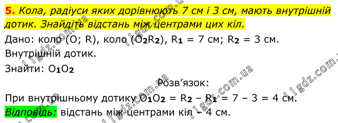 Кола, радіуси яких дорівнюють 7 см і 3 см, мають внутрішній дотик. Знайдіть відстань між центрами цих кіл. Дано: коло (O; R), коло (O2R2), R1 = 7 см; R2 = 3 см. Внутрішній дотик. Знайти: О1О2 Розв’язок: При внутрішньому дотику О1О2 = R2 – R1 = 7 – 3 = 4 см. Відповідь: відстань між центрами кіл – 4 см.