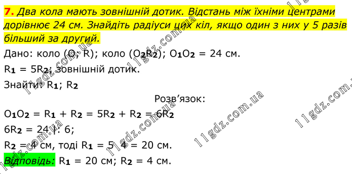 Два кола мають зовнішній дотик. Відстань між їхніми центрами дорівнює 24 см. Знайдіть радіуси цих кіл, якщо один з них у 5 разів більший за другий. Дано: коло (O; R); коло (O2R2); О1О2 = 24 см. R1 = 5R2; зовнішній дотик. Знайти: R1; R2 Розв’язок: O1O2 = R1 + R2 = 5R2 + R2 = 6R2 6R2 = 24 |: 6; R2 = 4 см, тоді R1 = 5 4 = 20 см. Відповідь: R1 = 20 см; R2 = 4 см.