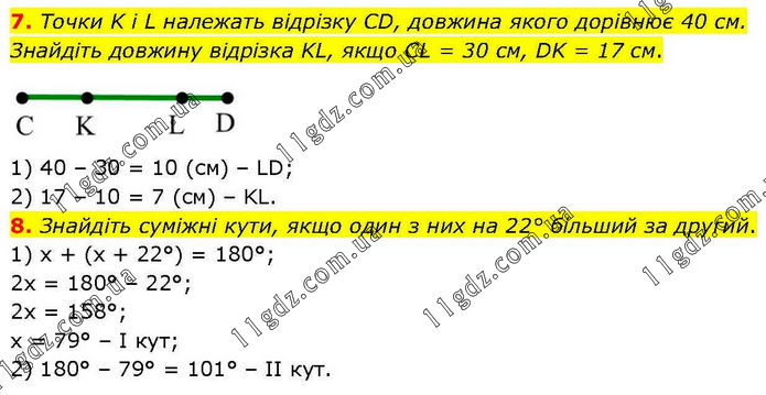 7. Точки K i L належать відрізку CD, довжина якого дорівнює 40 см. Знайдіть довжину відрізка KL, якщо CL = 30 см, DK = 17 см. 1) 40 – 30 = 10 (см) – LD; 2) 17 – 10 = 7 (см) – KL. 8. Знайдіть суміжні кути, якщо один з них на 22° більший за другий. 1) х + (х + 22°) = 180°; 2х = 180° – 22°; 2х = 158°; х = 79° – І кут; 2) 180° – 79° = 101° – ІІ кут.