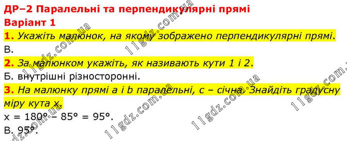 ДР–2 Паралельні та перпендикулярні прямі Варіант 1 1. Укажіть малюнок, на якому зображено перпендикулярні прямі. В. 2. За малюнком укажіть, як називають кути 1 і 2. Б. внутрішні різносторонні. 3. На малюнку прямі а і b паралельні, с – січна. Знайдіть градусну міру кута х. х = 180° – 85° = 95°. В. 95°.