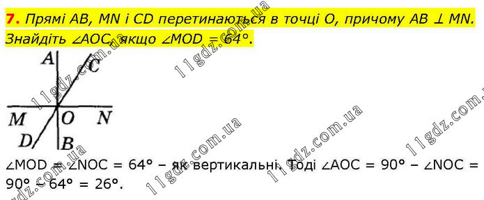 7. Прямі AB, MN і CD перетинаються в точці О, причому AB ⊥ MN. Знайдіть ∠AOC, якщо ∠MOD = 64°. ∠MOD = ∠NOС = 64° – як вертикальні. Тоді ∠AOC = 90° – ∠NOС = 90° – 64° = 26°.