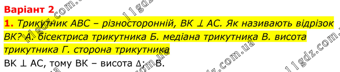 Варіант 2 1. Трикутник АВС – різносторонній, ВК ⊥ АС. Як називають відрізок ВК? A. бісектриса трикутника Б. медіана трикутника B. висота трикутника Г. сторона трикутника BK ⊥ AC, тому ВК – висота ∆; В.