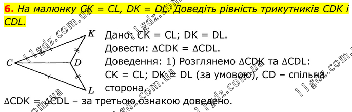 На малюнку СК = СL, DК = DL. Доведіть рівність трикутників СDК і СDL. Дано: CK = CL; DK = DL. Довести: ∆CDK = ∆CDL. Доведення: 1) Розглянемо ∆CDK та ∆CDL: CK = CL; DK = DL (за умовою), CD – спільна сторона. ∆CDK = ∆CDL – за третьою ознакою доведено.