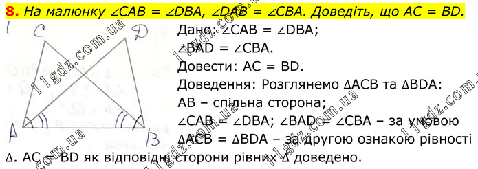 На малюнку ∠САВ = ∠DВА, ∠DАВ = ∠СВА. Доведіть, що АС = ВD. Дано: ∠CAB = ∠DBA; ∠BAD = ∠CBA. Довести: АС = BD. Доведення: Розглянемо ∆АСВ та ∆BDA: AB – спільна сторона; ∠CAB = ∠DBA; ∠BAD = ∠CBA – за умовою ∆ACB = ∆BDA – за другою ознакою рівності ∆. AC = BD як відповідні сторони рівних ∆ доведено.