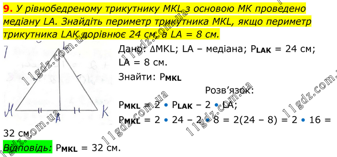 У рівнобедреному трикутнику МКL з основою МК проведено медіану LА. Знайдіть периметр трикутника МКL, якщо периметр трикутника LАК дорівнює 24 см, а LА = 8 см. Дано: ∆MKL; LA – медіана; PLAK = 24 см; LA = 8 см. Знайти: PMKL Розв’язок: PMKL = 2 • PLAK – 2 • LA; PMKL = 2 • 24 – 2 • 8 = 2(24 – 8) = 2 • 16 = 32 cм. Відповідь: PMKL = 32 cм.