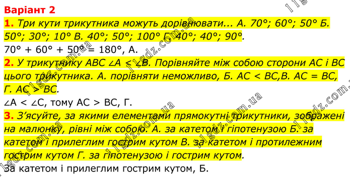 Варіант 2 1. Три кути трикутника можуть дорівнювати... A. 70°; 60°; 50° Б. 50°; 30°; 10° B. 40°; 50°; 100° Г. 40°; 40°; 90°. 70° + 60° + 50° = 180°, А. 2. У трикутнику АВС ∠А < ∠В. Порівняйте між собою сторони АС і ВС цього трикутника. A. порівняти неможливо, Б. АС < ВС,B. АС = ВС, Г. АС > ВС. ∠A < ∠C, тому АС > ВС, Г. 3. З’ясуйте, за якими елементами прямокутні трикутники, зображені на малюнку, рівні між собою. A. за катетом і гіпотенузою Б. за катетом і прилеглим гострим кутом B. за катетом і протилежним гострим кутом Г. за гіпотенузою і гострим кутом. За катетом і прилеглим гострим кутом, Б.