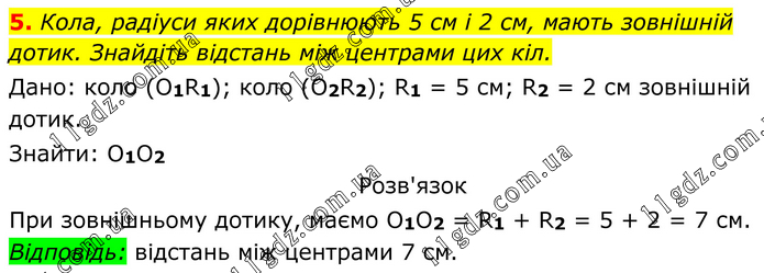 Кола, радіуси яких дорівнюють 5 см і 2 см, мають зовнішній дотик. Знайдіть відстань між центрами цих кіл. Дано: коло (О1R1); коло (О2R2); R1 = 5 см; R2 = 2 см зовнішній дотик. Знайти: О1О2 Розв'язок При зовнішньому дотику, маємо О1О2 = R1 + R2 = 5 + 2 = 7 см. Відповідь: відстань між центрами 7 см.
