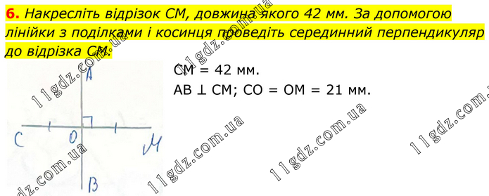 Накресліть відрізок СМ, довжина якого 42 мм. За допомогою лінійки з поділками і косинця проведіть серединний перпендикуляр до відрізка СМ. СМ = 42 мм. АВ ⊥ СМ; СО = ОМ = 21 мм.