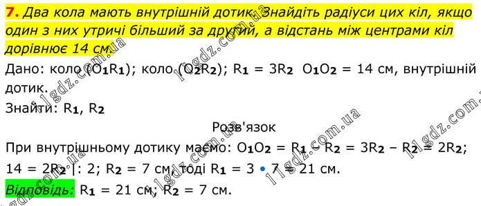 Два кола мають внутрішній дотик. Знайдіть радіуси цих кіл, якщо один з них утричі більший за другий, а відстань між центрами кіл дорівнює 14 см. Дано: коло (О1R1); коло (О2R2); R1 = 3R2 O1O2 = 14 см, внутрішній дотик. Знайти: R1, R2 Розв'язок При внутрішньому дотику маємо: O1O2 = R1 – R2 = 3R2 – R2 = 2R2; 14 = 2R2 |: 2; R2 = 7 см, тоді R1 = 3 • 7 = 21 см. Відповідь: R1 = 21 см; R2 = 7 см.
