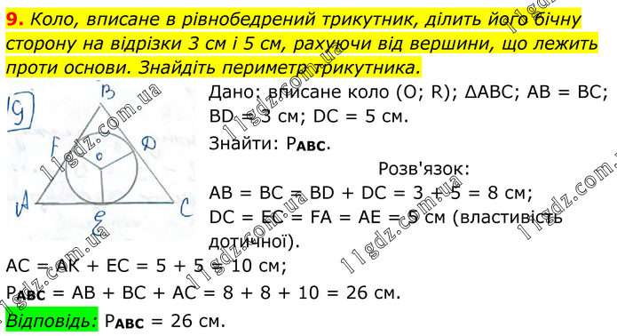 Коло, вписане в рівнобедрений трикутник, ділить його бічну сторону на відрізки 3 см і 5 см, рахуючи від вершини, що лежить проти основи. Знайдіть периметр трикутника. Дано: вписане коло (О; R); ∆ABC; AB = BC; BD = 3 см; DC = 5 см. Знайти: РАВС. Розв'язок: AB = BC = BD + DC = 3 + 5 = 8 см; DC = EC = FA = AE = 5 см (властивість дотичної). АС = АК + ЕС = 5 + 5 = 10 см; РАВС = АВ + ВС + АС = 8 + 8 + 10 = 26 см. Відповідь: РАВС = 26 см.