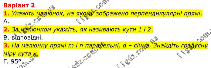 Варіант 2 1. Укажіть малюнок, на якому зображено перпендикулярні прямі. А. 2. За малюнком укажіть, як називають кути 1 і 2. B. відповідні. 3. На малюнку прямі m i n паралельні, d – січна. Знайдіть градусну міру кута х. Г. 95°.