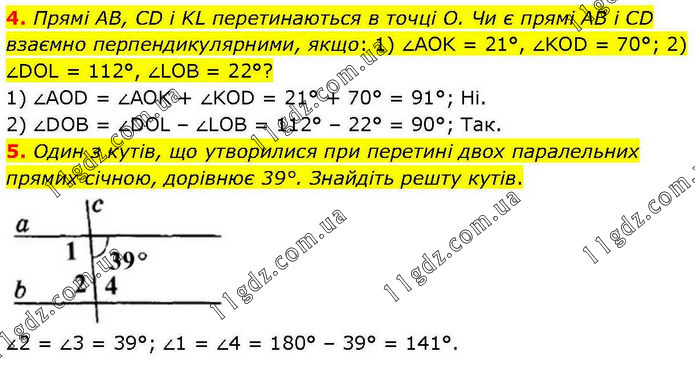 4. Прямі AB, CD і KL перетинаються в точці О. Чи є прямі AB і CD взаємно перпендикулярними, якщо: 1) ∠AOK = 21°, ∠KOD = 70°; 2) ∠DOL = 112°, ∠LOB = 22°? 1) ∠AOD = ∠AOK + ∠KOD = 21° + 70° = 91°; Ні. 2) ∠DOB = ∠DOL – ∠LOB = 112° – 22° = 90°; Так. 5. Один з кутів, що утворилися при перетині двох паралельних прямих січною, дорівнює 39°. Знайдіть решту кутів. ∠2 = ∠3 = 39°; ∠1 = ∠4 = 180° – 39° = 141°.