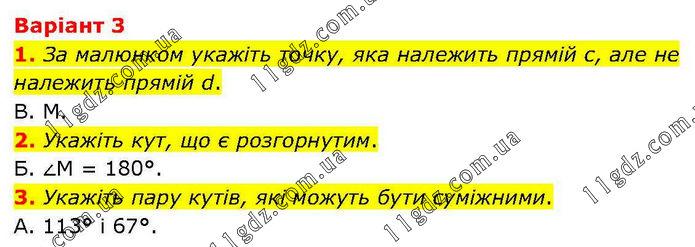 Варіант 3 1. За малюнком укажіть точку, яка належить прямій с, але не належить прямій d. В. M. 2. Укажіть кут, що є розгорнутим. Б. ∠M = 180°. 3. Укажіть пару кутів, які можуть бути суміжними. A. 113° і 67°.