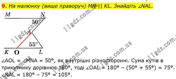 На малюнку (вище праворуч) MN || KL. Знайдіть ∠NAL. ∠AOL = ∠MNA = 50°, як внутрішні різносторонні. Сума кутів в трикутнику дорівнює 180°, тоді ∠OAL = 180° – (50° + 55°) = 75°. ∠NAL = 180° – 75° = 105°.