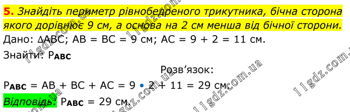 Знайдіть периметр рівнобедреного трикутника, бічна сторона якого дорівнює 9 см, а основа на 2 см менша від бічної сторони. Дано: ∆АВС; АВ = ВС = 9 см; АС = 9 + 2 = 11 см. Знайти: РАВС Розв’язок: РАВС = АВ + ВС + АС = 9 • 2 + 11 = 29 см. Відповідь: РАВС = 29 см.