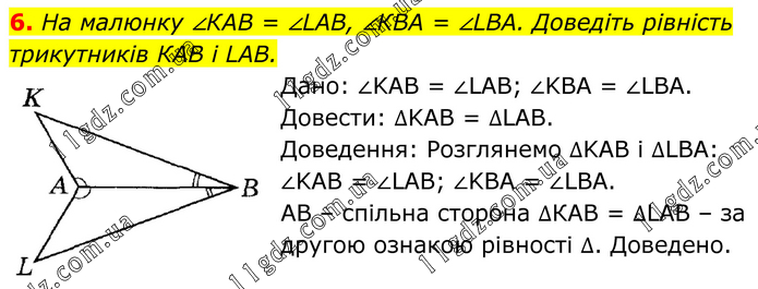 На малюнку ∠КАВ = ∠LАВ, ∠КВА = ∠LВА. Доведіть рівність трикутників КАВ і LАB. Дано: ∠KAB = ∠LAB; ∠KBA = ∠LBA. Довести: ∆KAB = ∆LAB. Доведення: Розглянемо ∆KAB i ∆LBA: ∠KAB = ∠LAB; ∠KBA = ∠LBA. AB – спільна сторона ∆КАВ = ∆LAB – за другою ознакою рівності ∆. Доведено.