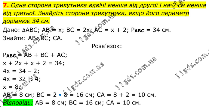 Одна сторона трикутника вдвічі менша від другої і на 2 см менша від третьої. Знайдіть сторони трикутника, якщо його периметр дорівнює 34 см. Дано: ∆АВС; АВ = х; ВС = 2х; АС = х + 2; РАВС = 34 см. Знайти: АВ; ВС; СА. Розв’язок: РАВС = АВ + ВС + АС; х + 2х + х + 2 = 34; 4х = 34 – 2; 4х = 32 |: 4; х = 8. АВ = 8 см; ВС = 2 • 8 = 16 см; СА = 8 + 2 = 10 см. Відповідь: АВ = 8 см; ВС = 16 см; СА = 10 см.