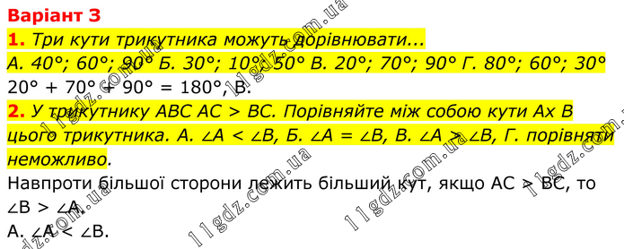 Варіант З 1. Три кути трикутника можуть дорівнювати... A. 40°; 60°; 90° Б. 30°; 10°; 50° B. 20°; 70°; 90° Г. 80°; 60°; 30° 20° + 70° + 90° = 180°, B. 2. У трикутнику АВС АС > ВС. Порівняйте між собою кути Ах В цього трикутника. A. ∠А < ∠В, Б. ∠А = ∠В, B. ∠А > ∠В, Г. порівняти неможливо. Навпроти більшої сторони лежить більший кут, якщо АС > ВС, то ∠В > ∠А. А. ∠А < ∠В.