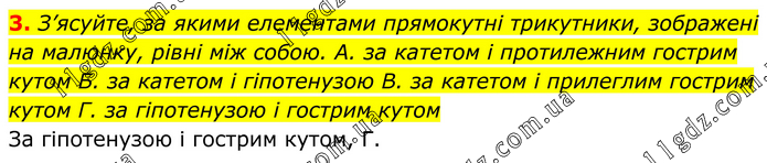 3. З’ясуйте, за якими елементами прямокутні трикутники, зображені на малюнку, рівні між собою. A. за катетом і протилежним гострим кутом Б. за катетом і гіпотенузою B. за катетом і прилеглим гострим кутом Г. за гіпотенузою і гострим кутом За гіпотенузою і гострим кутом, Г.