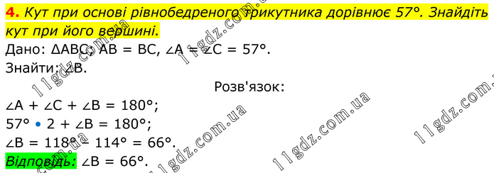 Кут при основі рівнобедреного трикутника дорівнює 57°. Знайдіть кут при його вершині. Дано: ∆АВС; АВ = ВС, ∠А = ∠С = 57°. Знайти: ∠В. Розв'язок: ∠А + ∠С + ∠В = 180°; 57° • 2 + ∠В = 180°; ∠В = 118° – 114° = 66°. Відповідь: ∠В = 66°.