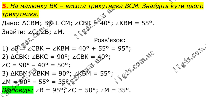 На малюнку ВК – висота трикутника ВСМ. Знайдіть кути цього трикутника. Дано: ∆СВМ; ВК ⊥ СМ; ∠СВК = 40°; ∠КВМ = 55°. Знайти: ∠С; ∠В; ∠М. Розв'язок: 1) ∠В = ∠СВК + ∠КВМ = 40° + 55° = 95°; 2) ∆СВК: ∠ВКС = 90°; ∠СВК = 40°; ∠С = 90° – 40° = 50°; 3) ∆КВМ: ∠ВКМ = 90°; ∠КВМ = 55°; ∠М = 90° – 55° = 35°. Відповідь: ∠В = 95°; ∠С = 50°; ∠М = 35°.