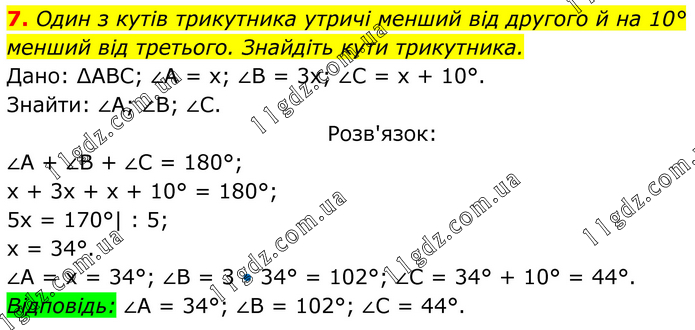 Один з кутів трикутника утричі менший від другого й на 10° менший від третього. Знайдіть кути трикутника. Дано: ∆АВС; ∠А = x; ∠B = 3x; ∠C = x + 10°. Знайти: ∠А; ∠В; ∠С. Розв'язок: ∠А + ∠В + ∠С = 180°; x + 3x + x + 10° = 180°; 5x = 170°| : 5; x = 34°. ∠A = x = 34°; ∠B = 3 • 34° = 102°; ∠C = 34° + 10° = 44°. Відповідь: ∠А = 34°; ∠В = 102°; ∠С = 44°.