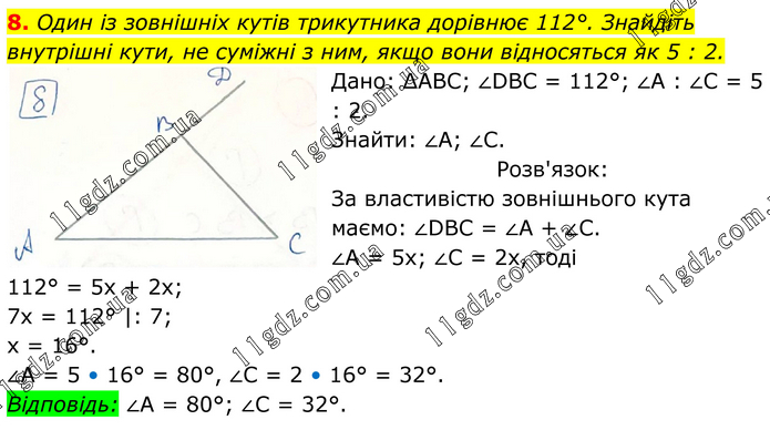 Один із зовнішніх кутів трикутника дорівнює 112°. Знайдіть внутрішні кути, не суміжні з ним, якщо вони відносяться як 5 : 2. Дано: ∆АВС; ∠DBC = 112°; ∠A : ∠C = 5 : 2. Знайти: ∠А; ∠С. Розв'язок: За властивістю зовнішнього кута маємо: ∠DBC = ∠A + ∠C. ∠A = 5x; ∠C = 2x, тоді 112° = 5x + 2x; 7x = 112° |: 7; x = 16°. ∠A = 5 • 16° = 80°, ∠C = 2 • 16° = 32°. Відповідь: ∠А = 80°; ∠С = 32°.