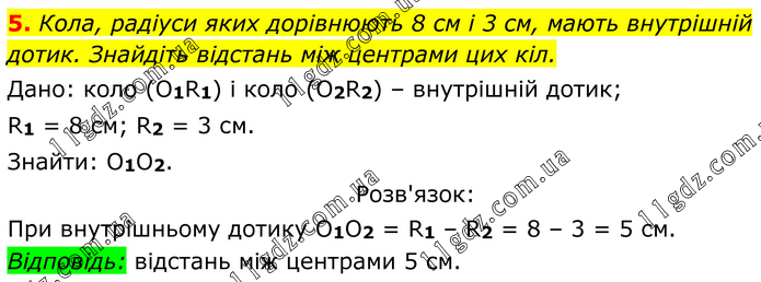 Кола, радіуси яких дорівнюють 8 см і 3 см, мають внутрішній дотик. Знайдіть відстань між центрами цих кіл. Дано: коло (O1R1) і коло (O2R2) – внутрішній дотик; R1 = 8 см; R2 = 3 см. Знайти: О1О2. Розв'язок: При внутрішньому дотику О1О2 = R1 – R2 = 8 – 3 = 5 см. Відповідь: відстань між центрами 5 см.
