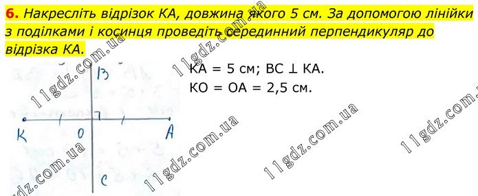 Накресліть відрізок КА, довжина якого 5 см. За допомогою лінійки з поділками і косинця проведіть серединний перпендикуляр до відрізка КА. KA = 5 см; ВС ⊥ КА. КО = ОА = 2,5 см.