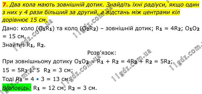 Два кола мають зовнішній дотик. Знайдіть їхні радіуси, якщо один з них у 4 рази більший за другий, а відстань між центрами кіл дорівнює 15 см. Дано: коло (O1R1) та коло (O2R2) – зовнішній дотик; R1 = 4R2; O1O2 = 15 см. Знайти: R1, R2. Розв'язок: При зовнішньому дотику O1O2 = R1 + R2 = 4R2 + R2 = 5R2; 15 = 5R2 |: 5 R2 = 3 см; Тоді R1 = 4 • 3 = 13 см. Відповідь: R1 = 12 см; R2 = 3 см.