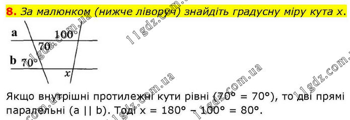 8. За малюнком (нижче ліворуч) знайдіть градусну міру кута х. Якщо внутрішні протилежні кути рівні (70° = 70°), то дві прямі паралельні (a || b). Тоді х = 180° – 100° = 80°.