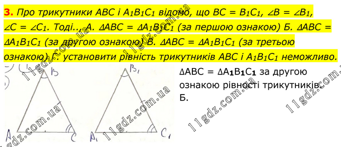 3. Про трикутники АВС і А1В1С1 відомо, що ВС = В1С1, ∠В = ∠В1, ∠С = ∠С1. Тоді.., A. ∆АВС = ∆А1В1С1 (за першою ознакою) Б. ∆АВС = ∆А1В1С1 (за другою ознакою) B. ∆АВС = ∆А1В1С1 (за третьою ознакою) Г. установити рівність трикутників АВС і А1В1С1 неможливо. ∆ABC = ∆A1B1C1 за другою ознакою рівності трикутників. Б.