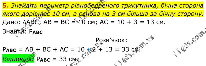 Знайдіть периметр рівнобедреного трикутника, бічна сторона якого дорівнює 10 см, а основа на 3 см більша за бічну сторону. Дано: ∆АВС; АВ = ВС = 10 см; АС = 10 + 3 = 13 см. Знайти: РАВС Розв’язок: РАВС = АВ + ВС + АС = 10 • 2 + 13 = 33 см. Відповідь: РАВС = 33 см.