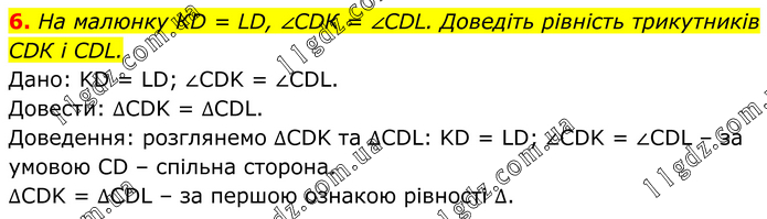 На малюнку КD = LD, ∠СDК = ∠СDL. Доведіть рівність трикутників СDК і СDL. Дано: KD = LD; ∠CDK = ∠CDL. Довести: ∆CDK = ∆CDL. Доведення: розглянемо ∆CDK та ∆CDL: KD = LD; ∠CDK = ∠CDL – за умовою CD – спільна сторона. ∆CDK = ∆CDL – за першою ознакою рівності ∆.