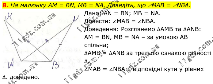 На малюнку АМ = ВN, МВ = NА. Доведіть, що ∠МАВ = ∠NВА. Дано: AN = BN; MB = NA. Довести: ∠MAB = ∠NBA. Доведення: Розглянемо ∆АМВ та ∆ANB: AM = BN, MB = NA – за умовою АВ спільна; ∆AMB = ∆ANB за третьою ознакою рівності ∆. ∠MAB = ∠NBA – відповідні кути у рівних ∆. доведено.