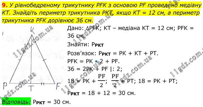 У рівнобедреному трикутнику РFК з основою РF проведено медіану КТ. Знайдіть периметр трикутника РКТ, якщо КТ = 12 см, а периметр трикутника РFК дорівнює 36 см. Дано: ∆PFK; KT – медіана KT = 12 см; PFK = 36 см. Знайти: PPKT Розв’язок: РРКТ = РК + КТ + РТ. PFK = PK • 2 + PF. 36 = 2PK + PF |: 2; 18 = PK + PF/2; PF/2 = PT; 18 = PK + PT; PPKT = 18 + 12 = 30 см. Відповідь: РРКТ = 30 см.