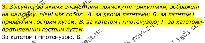 З’ясуйте, за якими елементами прямокутні трикутники, зображені на малюнку, рівні між собою. A. за двома катетами; Б. за катетом і прилеглим гострим кутом; B. за катетом і гіпотенузою; Г. за катетом і протилежним гострим кутом. За катетом і гіпотенузою, В.