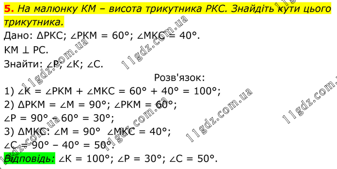 На малюнку КМ – висота трикутника РКС. Знайдіть кути цього трикутника. Дано: ∆РКС; ∠РКМ = 60°; ∠MKC = 40°. KM ⊥ PC. Знайти: ∠Р; ∠К; ∠С. Розв'язок: 1) ∠K = ∠PKM + ∠MKC = 60° + 40° = 100°; 2) ∆PKM = ∠M = 90°; ∠PKM = 60°; ∠P = 90° – 60° = 30°; 3) ∆MKC: ∠M = 90° ∠MKC = 40°; ∠C = 90° – 40° = 50°. Відповідь: ∠К = 100°; ∠Р = 30°; ∠С = 50°.