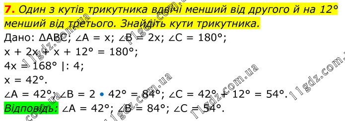 Один з кутів трикутника вдвічі менший від другого й на 12° менший від третього. Знайдіть кути трикутника. Дано: ∆АВС; ∠А = х; ∠В = 2x; ∠C = 180°; x + 2x + x + 12° = 180°; 4x = 168° |: 4; x = 42°. ∠A = 42°; ∠B = 2 • 42° = 84°; ∠C = 42° + 12° = 54°. Відповідь: ∠А = 42°; ∠В = 84°; ∠С = 54°.