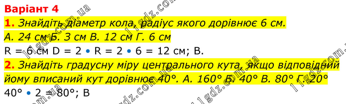 Варіант 4 1. Знайдіть діаметр кола, радіус якого дорівнює 6 см. А. 24 см Б. З см В. 12 см Г. 6 см R = 6 см D = 2 • R = 2 • 6 = 12 см; В. 2. Знайдіть градусну міру центрального кута, якщо відповідний йому вписаний кут дорівнює 40°. А. 160° Б. 40° В. 80° Г. 20° 40° • 2 = 80°; В