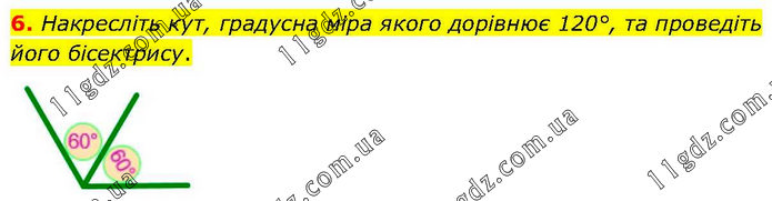 6. Накресліть кут, градусна міра якого дорівнює 120°, та проведіть його бісектрису.