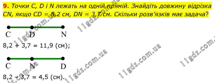 9. Точки С, D і N лежать на одній прямій. Знайдіть довжину відрізка CN, якщо CD = 8,2 см, DN = 3,7 см. Скільки розв’язків має задача? 8,2 + 3,7 = 11,9 (см); 8,2 – 3,7 = 4,5 (см).