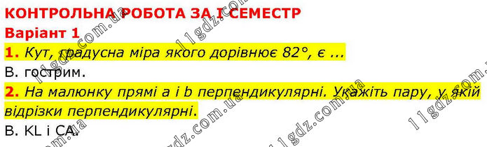 КОНТРОЛЬНА РОБОТА ЗА І СЕМЕСТР Варіант 1 1. Кут, градусна міра якого дорівнює 82°, є ... В. гострим. 2. На малюнку прямі а і b перпендикулярні. Укажіть пару, у якій відрізки перпендикулярні. B. KL і CA.